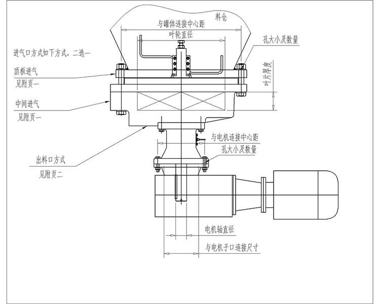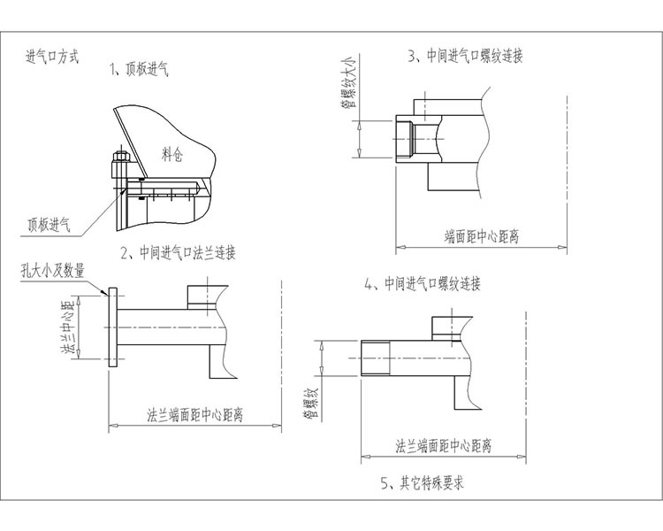 1、先將給料機(jī)與料倉用螺栓連接緊固,中間需有密封墊(圈),保持密封,再將進(jìn)氣口和出料口分別與外部的管路相連接;給料機(jī)軸承座上有三處接口,分別為平衡孔、吹掃孔、注油孔,平衡孔與吹掃孔連接一路氣源,注油孔每三個(gè)月加注一次黃油。三處接口在不同的給料機(jī)軸承座上的位置不同,請(qǐng)現(xiàn)場查看指示牌。